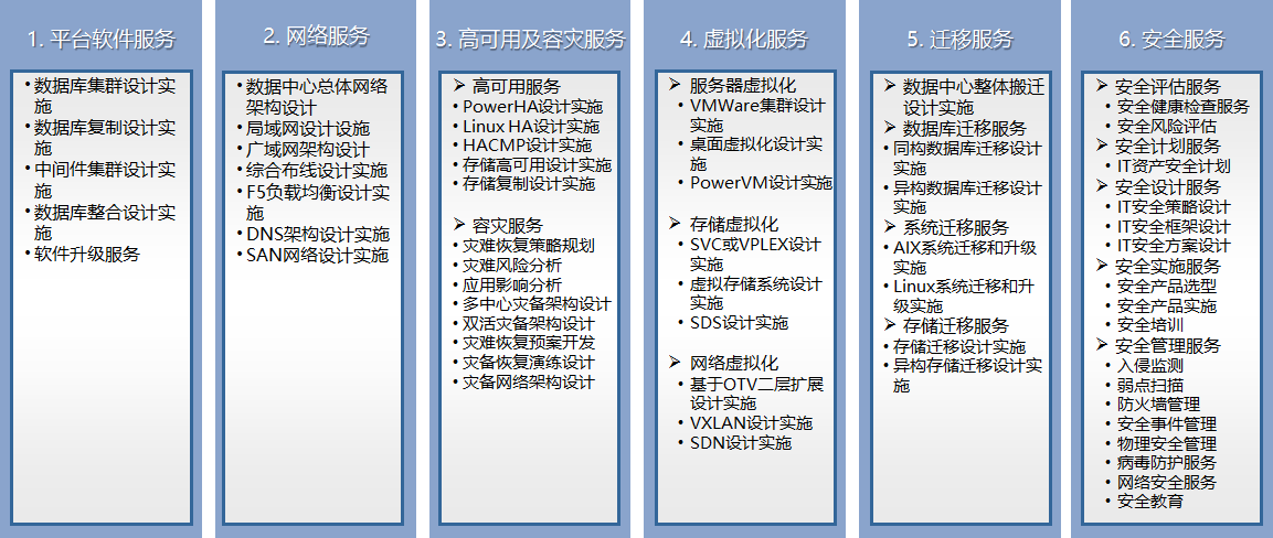 天港惠达拥有获得IBM资深架构师认证的专家,理论有高度,实践有经验,基于IBM企业架构和TOGAF理论框架,并结合客户的实际需求,设计了全面的数据中心系统集成服务体系,如图所示: